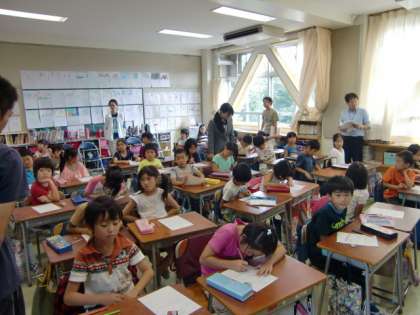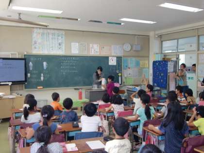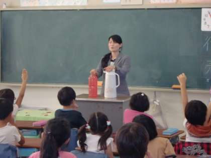 3年次研修の研究授業を行いました。単元は「水のかさ」。異なる容器(ペットボトルとポット)の中に入っている水の量(かさ)の違いを比べる方法を考えました。