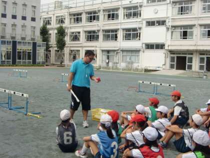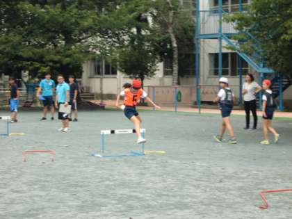 10年研修の一環で4校時に校庭で体育の研究授業を行いました。単元は「ハードル走」。準備運動の後、ミニハードルでハードル間を3〜5歩で走る練習を行いました。その後、赤玉を使ってハードルから遠い位置での踏み切り、振り上げ足をまっすぐ前に伸ばす、丸めた新聞紙を使って頭の位置を低くするの三つを意識して練習しました。