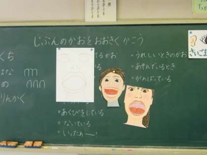鏡を見ながら、口を開けた自分の顔を描く学習です。