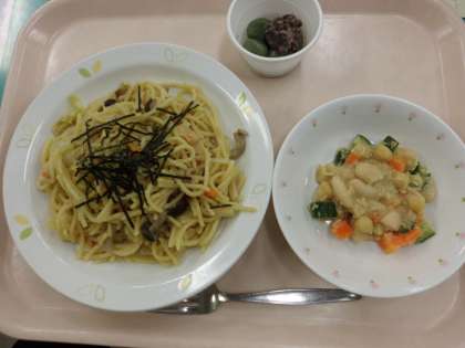 和風スパゲティ・牛乳・ビーンズサラダ・よもぎだんご