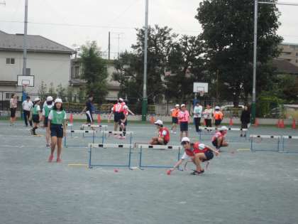 ハードルを走り越す際に上体を前傾させるためのポイントとして「ハードルから遠い位置で踏み切る」「振り上げ足をまっすぐ前に伸ばす」「頭の位置を低くする」ことを取り上げ、それぞれが自分に合った課題を見つけ、めあてをもちやすいように工夫した授業でした。