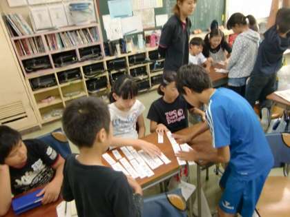 今日の学習は「短歌」。4年生までに習った百人一首を思い出すところからスタート。四つの短歌の季節や風景が分かる言葉、意味が分からない言葉をあきらかにしながら、意味を考え、音読しました。最後は、ぱらぱらになったカードをグループで協力して元の短歌に構成していました。