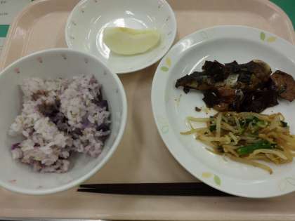 さつまいもごはん・牛乳・さんまの松前煮・もやしのごま風味・くだもの