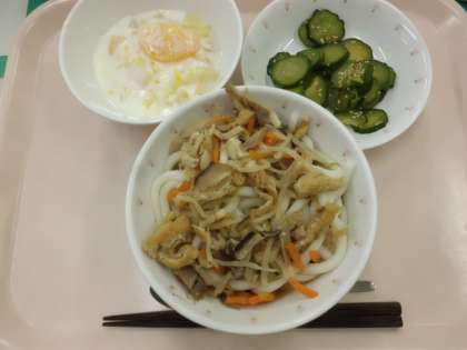 五目冷やしうどん・牛乳・きゅうりの中華味・フルーツヨーグルト