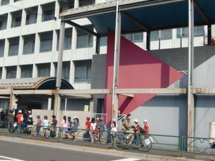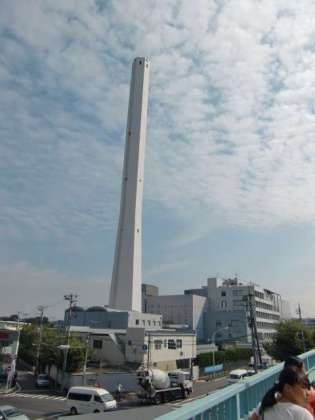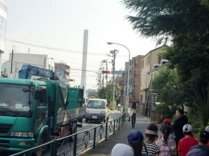 昨年度までの世田谷清掃工場に代わって、今年は千歳清掃工場を見学しました。規模の関係で2クラスずつの見学です。40分歩いて清掃工場に到着です。煙突の高さは130mだそうです。