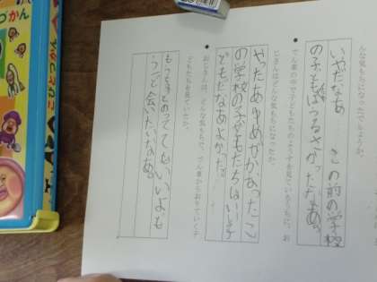 今日は、「おじさんのてがみ」という単元です。公共の場できまりを守り、人に迷惑をかけないようにすることを考えました。活発に発表する様子が見られました。