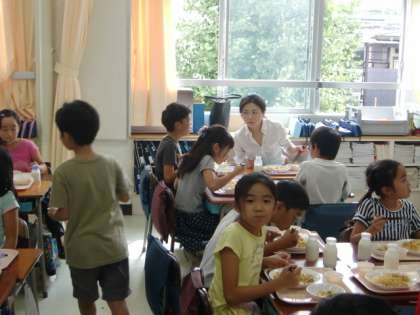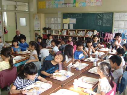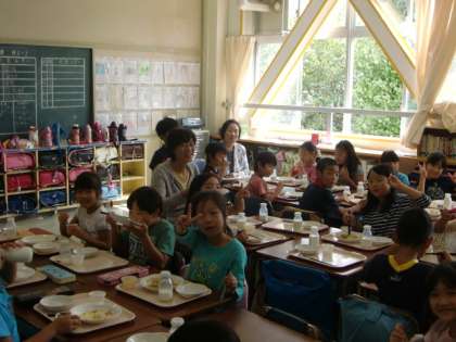 避難所運営会議のメンバーの方々が各教室に分かれ、子どもたちと一緒に給食を食べました。今後、こういう機会をできるだけ持ちたいと思います。