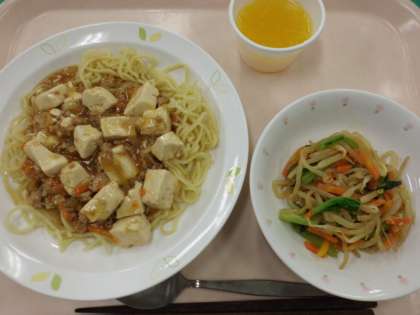 麻婆豆腐焼きそば・牛乳・ナムル・みかんゼリー