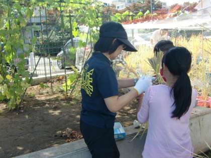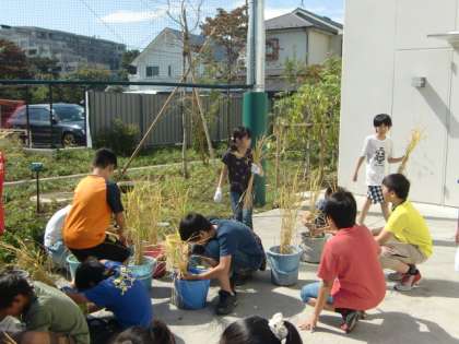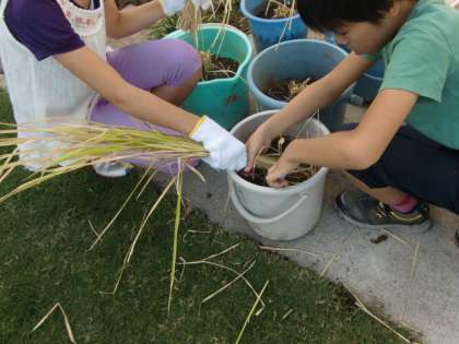 いよいよ待望の稲刈りです。ハサミで刈り(切り)取って、ひもでしばって干します。