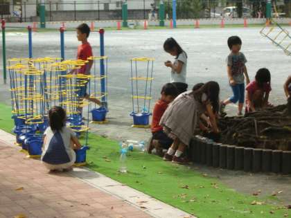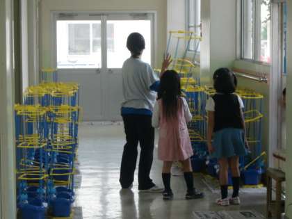 1年生が来週月曜日に接近するかもしれない台風に備えて、あさがおの鉢を校舎内に避難しています。