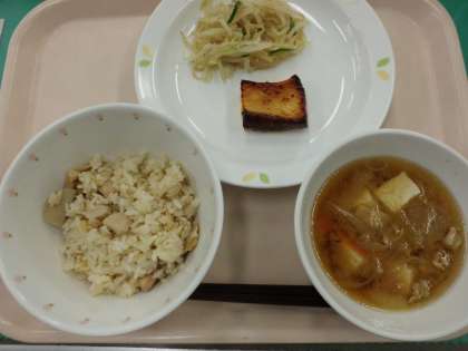 里芋ごはん・牛乳・いかの照り焼き・ごま酢かけ・豚汁