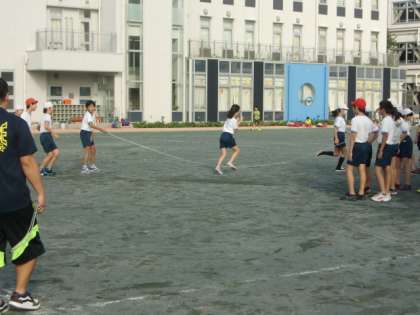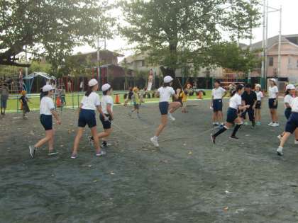 7時50分から連合運動会に向けた練習が行われています。種目ごとの練習の後は、クラスに分かれて長縄の練習です。