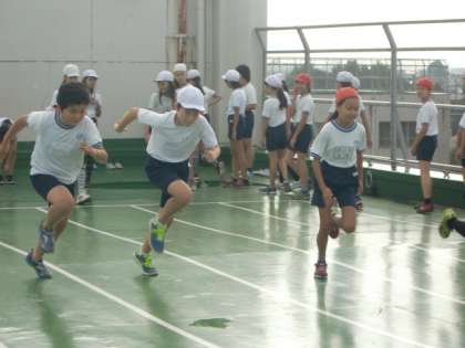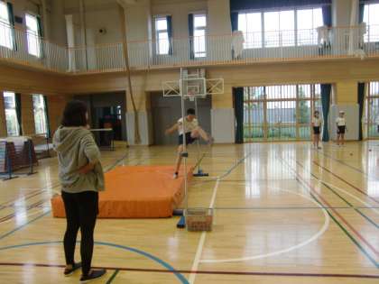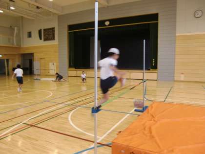 体育館では走り高跳びの練習、屋上では100メートル走のスタートの練習をしています。