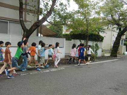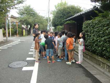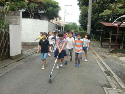 今日は「1kmを体感しよう」ということで、学校から1km分歩きました。ここで活躍するのが「ウォーキングメジャー」です。学校から駅に向かって歩き、途中で引き返してほぼ1kmになりました。