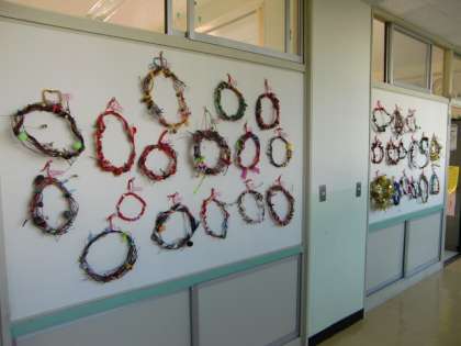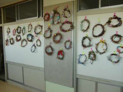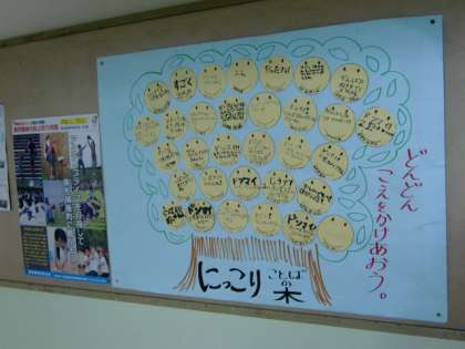 道徳の授業の学習を基にした「にっこりことばの木」とあさがおのつるで作ったリースです。