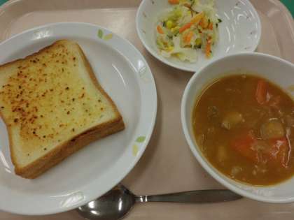 ガーリックトースト・牛乳・ビーンズシチュー・コールスローサラダ