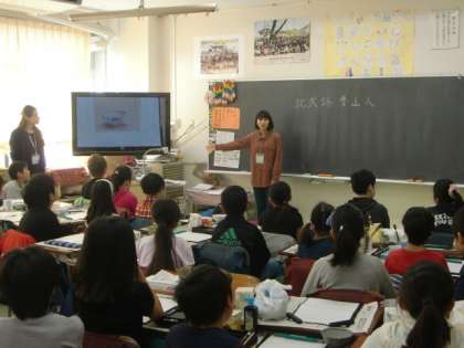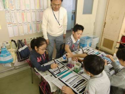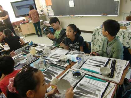 世田谷美術館の方々をゲストにお迎えして、先日の「北大路魯山人展」の事後授業を行いました。まず、濃淡の異なる墨を使って、半紙に筆で描く活動をしました。