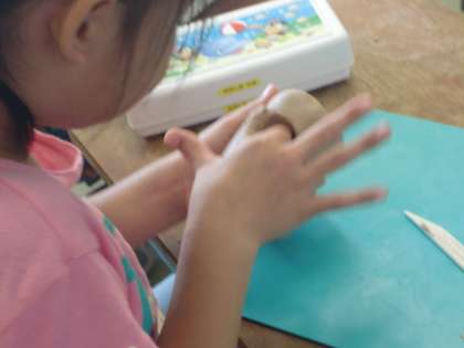 「うれシーサー、たのシーサー」。粘土を使ってシーサーを作る学習です。,粘土に穴をあけたら…。