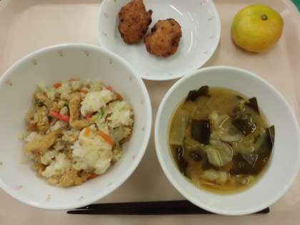 子ぎつねごはん・牛乳・豆腐のナゲット・きゃべつのみそ汁・くだもの