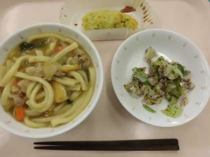 カレーうどん・牛乳・野菜のゆかりかけ・スイートポテト