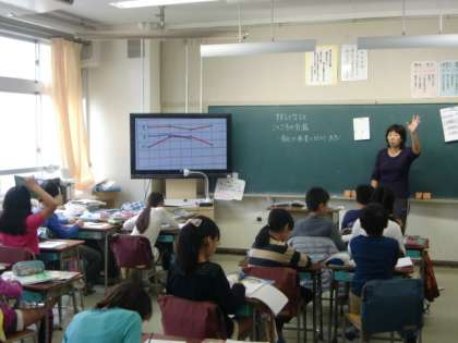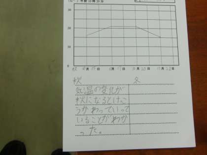 「すずしくなると」。春や夏の気温の変化のグラフとの違いを考えています。