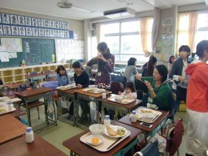 5年生の2教室に分かれて、給食を試食していただきました。