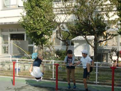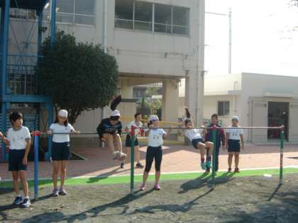 鉄棒の学習です。できる技を確認しています。