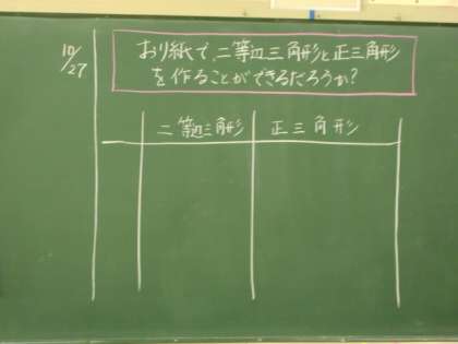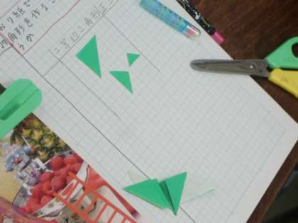 折り紙を使って二等辺三角形と正三角形を作る学習です。二等辺三角形はできたのですが・・・。