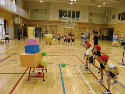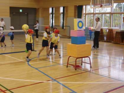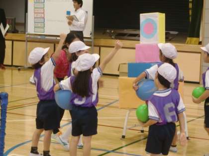 今回は、ボールなげゲーム「ねらえ!たおせ!まとあてゲーム」。的に向かって思い切りボールを投げる、友達と協力してゲームを楽しむことをめあてに行いました。