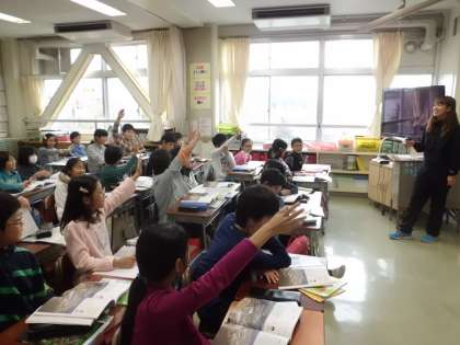 教科書の写真を見て、工場がどんなところにあるのかを考えています。