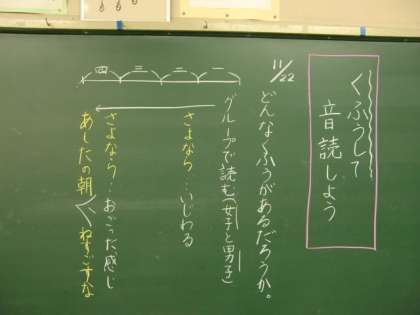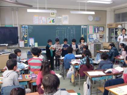 詩「夕日が背中をおしてくる」の音読発表会です。一人で読む子、グループで音読など、いろいろな形があります。