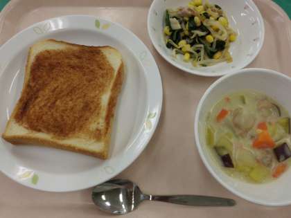 シナモントースト・牛乳・さつまいもシチュー・ほうれん草サラダ