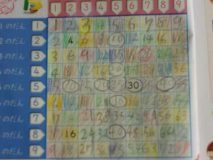「かけ算九九の表のひみつをさがそう」という学習です。一の位の数字に着目して色分けをしています。どんな秘密が見つかったでしょうか。