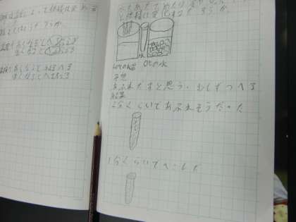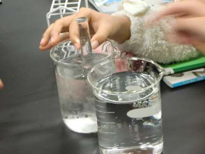 水をあたためたり、冷やしたりすると体積はどうなるかを確かめる実験です。試験管の中の水の微妙な変化に気づくことができたでしょうか。