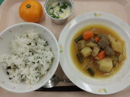 わかめごはん・牛乳・筑前煮・茶わん蒸し・くだもの
