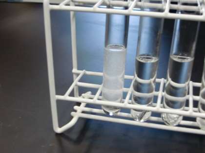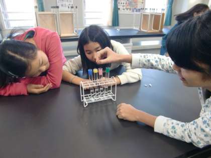 「水溶液の性質」。石灰石に塩酸を垂らすと、二酸化炭素が発生する実験は、教師が演示します。続いて、試験管の中の水酸化ナトリウム水溶液、アンモニア水、うすい塩酸、炭酸水にアルミニウム箔を入れ、どうなるかを観察しました。