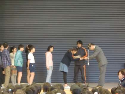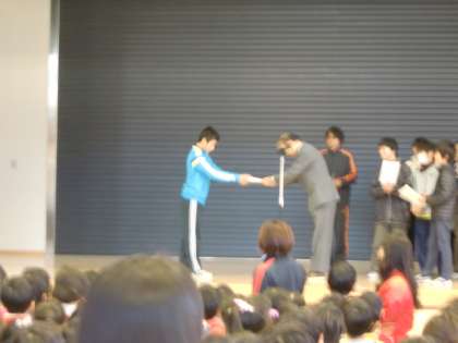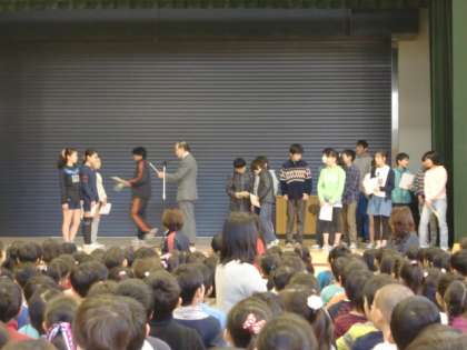 今朝はまず、水泳記録会と連合運動会でよい記録を残した6年生の表彰がありました。