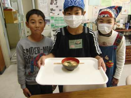 みそ汁の調理実習です。こちらの班はやや甘め。「さつま芋がとけちゃった」という話でした。「ごちそうさまでした!」