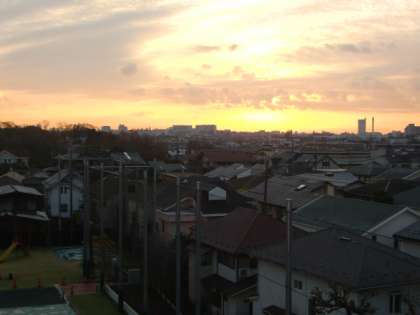 西の空には富士山が。蓋をしたプールには氷が張っています。