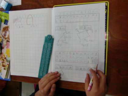 三角形と四角形の学習です。「へん」「ちょうてん」などの言葉も覚えます。