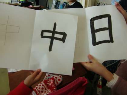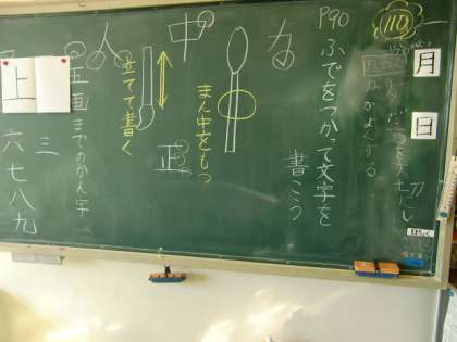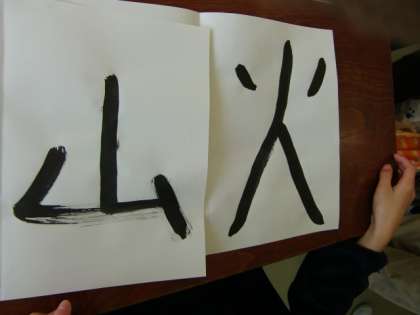 「ふでを使って文字を書こう」。いろいろな漢字一文字を書きました。