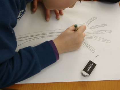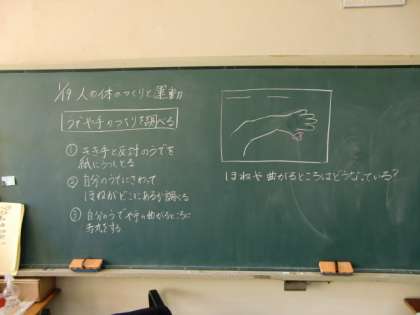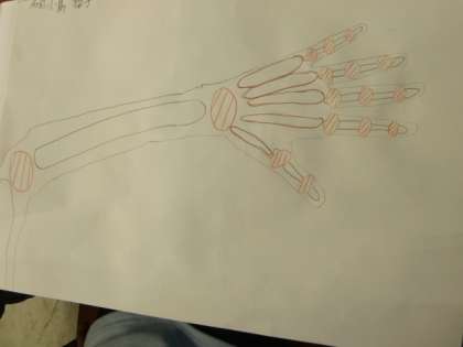 腕や手の骨がどのようなしくみになっているのか、予想して絵に描いています。