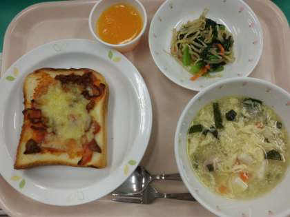 ピザトースト・牛乳・にらたまスープ・ナムル・キャロットゼリー