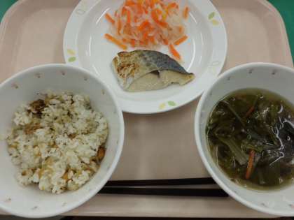 豆ごはん・牛乳・魚の西京焼き・紅白なます・七草風汁