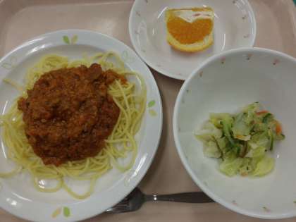 ミートソーススパゲティ・牛乳・ごぼうチップサラダ・くだもの