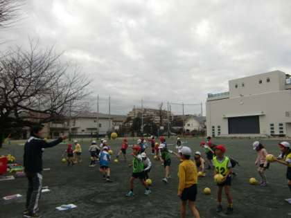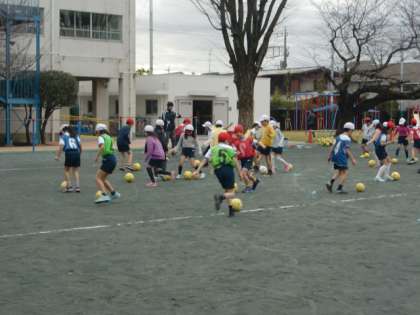 「ミニサッカー」の学習。1人1個ずつボールを持って、操る練習をしています。