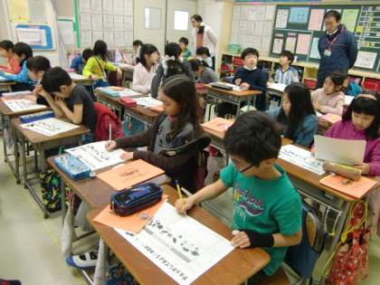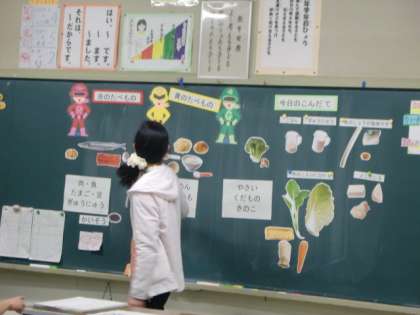 栄養士の先生による授業。「ショクレンジャー」の絵本を活用して、給食に含まれている3大栄養素の説明と、それらをバランスよく食べようという内容でした。
