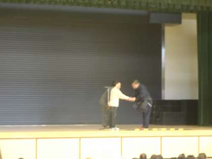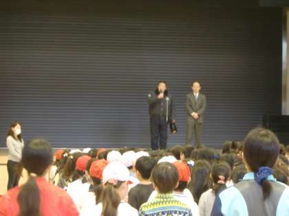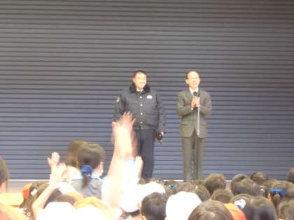 今朝は上祖師谷駐在所のМさんの紹介がありました。去年の9月に着任したМさんは時間に都合の付く限り工科高校前の信号に立って横断指導をしてくださっています。6年生がお礼の手紙を読み、手渡しました。今後もよろしくお願いいたします。