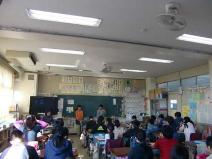 千歳小学校では学年によっていろいろな機会を利用してスピーチ活動を行っています。写真は5年2組の朝の会でのスピーチです。日直が話をしています。