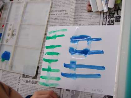 「オリジナル色紙をつくろう」。1組は「にじみ」、4組は四つの技法にさらに工夫を加える学習です。